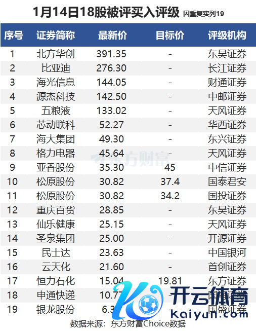 东方钞票Choice数据涌现,搁置1月14日19点,本日有18股被券商评为买入评级,包括朔方华创、比亚迪、五粮液、格力电器、松原股份、恒力石化、申通快递等股票,其中松原股份被2家券商评为买入评级。